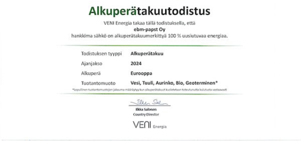 Omien aurinkopaneeleiden lisäksi ebm-papst Oy käyttää uusiutuvaa, alkuperätakuumerkittyä energiaa.