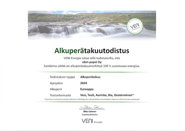 ebm-papst Oy:n Veni Energialta hankkima sähkö on alkuperätakuumerkittyä, 100% uusiutuvaa energiaa. Tuotantomuotoja ovat aurinko, vesi, tuuli, bio ja geoterminen energia.