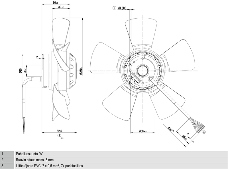 | Siipipyörä | Muovia PA, taaksepäin kaartuvat siivet 6 kpl |