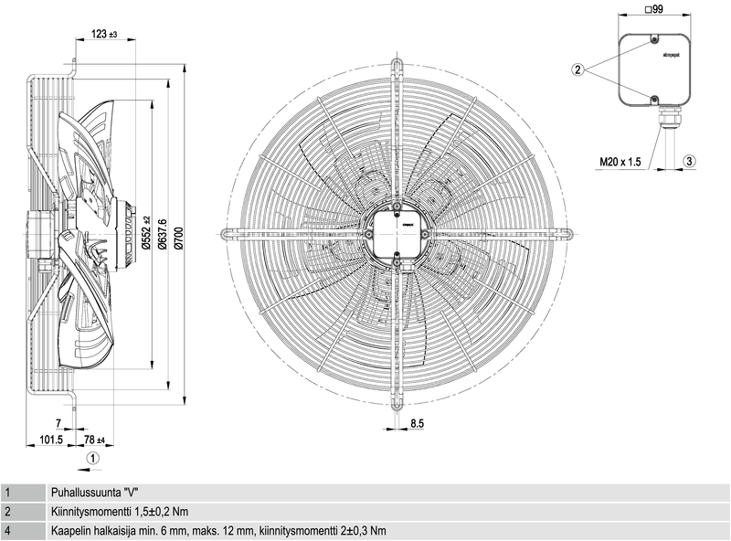 | Moottorin malli | Elektronisesti kommutoitu EC-ulkoroottorimoottori integroidulla ohjaustekniikalla |