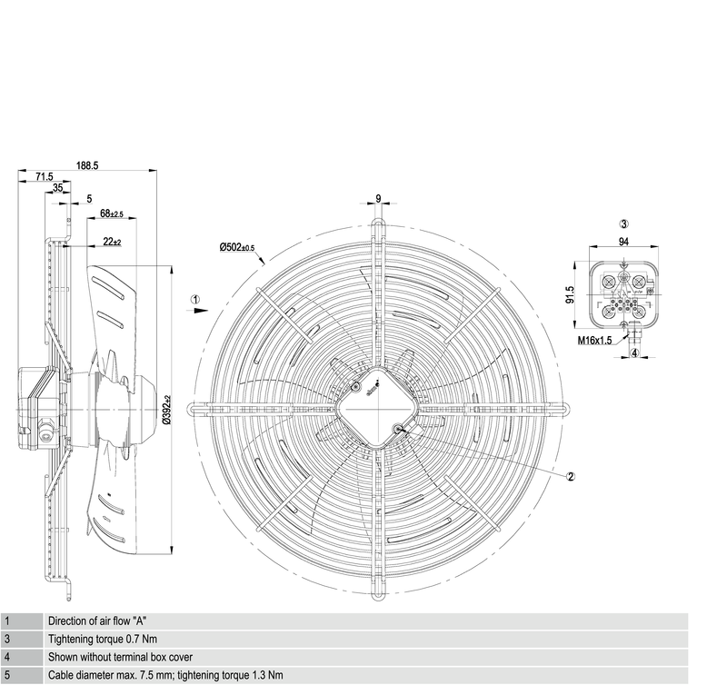 Aksiaalipuhallin jännitesäädettävällä AC-moottorilla ja suoralla koriverkolla. Puhallussuunta “A”.