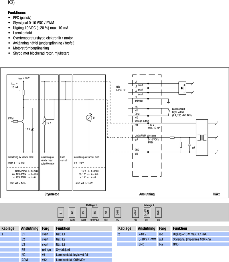 – kierrosluvun säätö 0-10 V signaalilla tai PWM