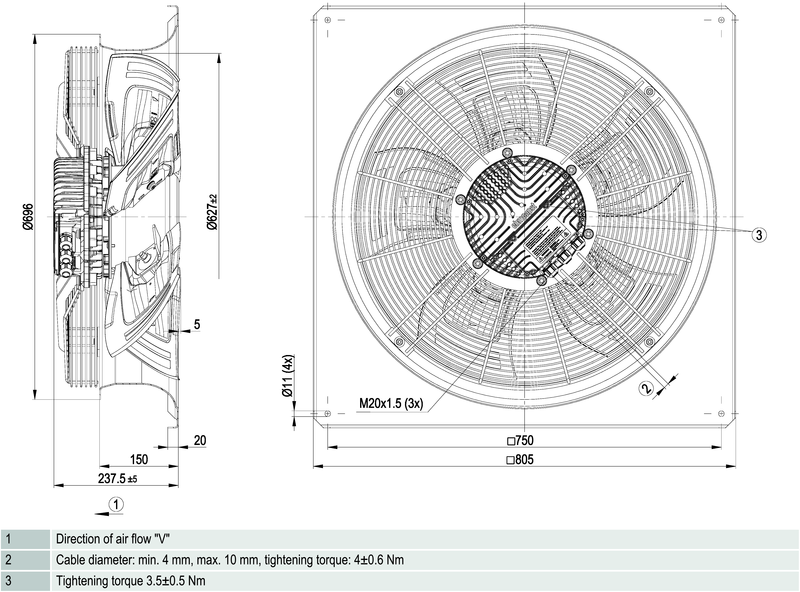 HyBlade-puhallin energiaa säästävällä EC-moottorilla. Neliömäinen seinälevy sekä suojaverkko. HyBlade-sarjan siipipyörien hybridirakenteen ansiosta puhaltimen äänitaso on erittäin alhainen ja puhallin on kevyt. Lisäksi sen hyötysuhde on erittäin korkea.