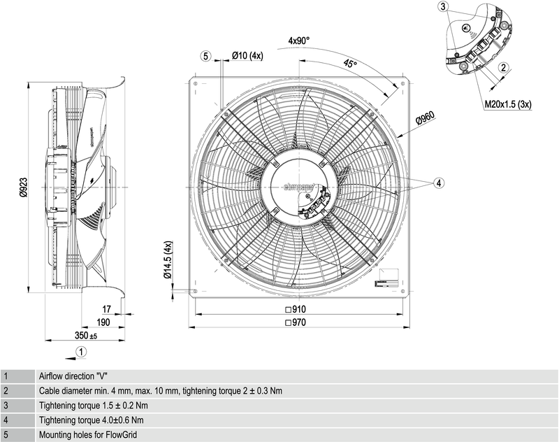 AxiBlade-sarjan aksiaalipuhallin varustettu EC-moottorilla, integroidulla elektroniikalla ja neliömäisellä seinälevyllä