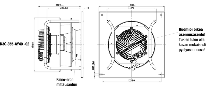 Asennusasento Akseli vaakasuoraan tai roottori alas, roottori ylös pyynnöstä