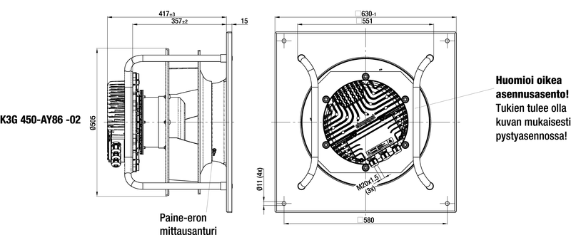 Asennusasento Akseli vaakasuoraan tai roottori alas, roottori ylös pyynnöstä