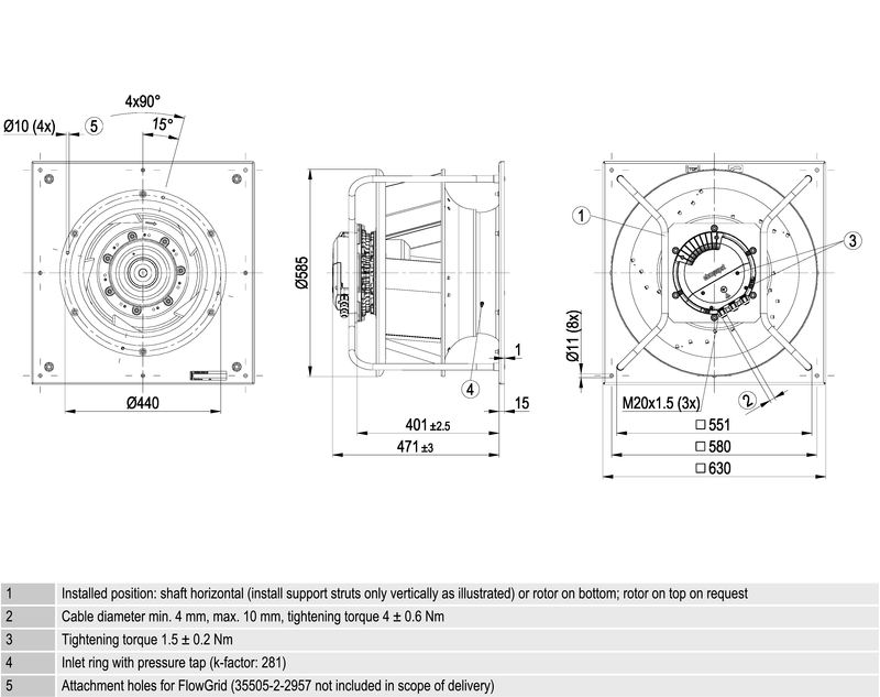 EC-radiaalimoduuli taaksepäin kaartuvin siivin, yhdeltä puolelta imevä, kannattimella.