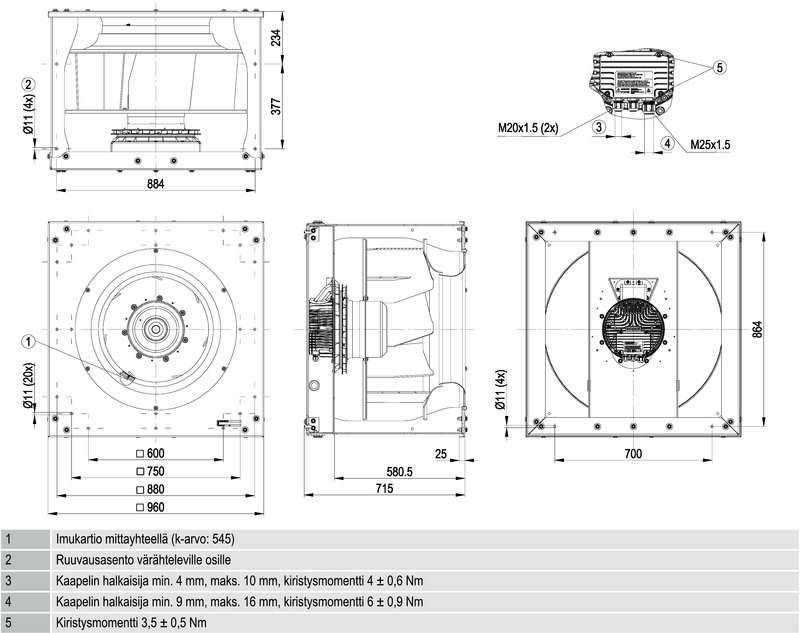 Tehokas kammiopuhallin EC-moottorilla ja integroidulla elektroniikalla. Yhdeltä puolelta imevä, taaksepäin kaartuvin siivin. Kuutiorakenne.Imukartiossa on K-arvon mittausyhde. Helppo asentaa, huoltovapaa käytössä. Asennuksessa on käytettävä tärinäneristimiä ja joustoliitintä – kysy myynnistä.