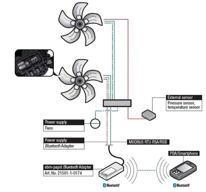Langattomaan ohjelmointiin ja monitorointiin. ebm-past-puhaltimet, joissa on RS485 adapteri voivat kommunikoida bluetooth-yhteensopivan laitteen, esim. älypuhelimen kanssa. Kommunikointiin koko verkon kanssa tarvitaan vain yksi adapteri.
