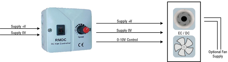 RMDC on helppo manuaalinen säätöratkaisu EC/DC-puhaltimille. RMDC syöttää 0-10V DC ulostulon lisäksi 12 tai 24V käyttöjännitteen puhaltimelle.
