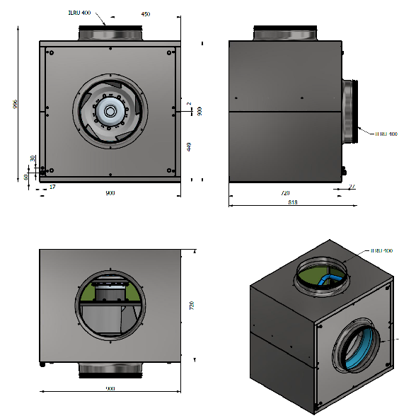 Boxfläkt storlek 900×900 med en effektiv EC-fläkt.