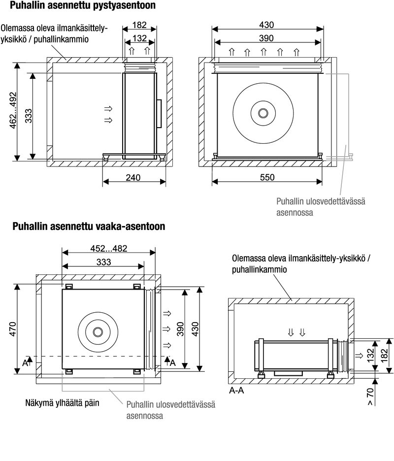 Asennusasento Akseli vaakasuoraan tai roottori alas, roottori ylös pyynnöstä