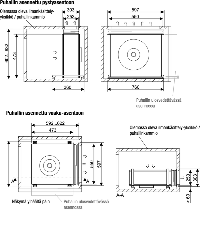 Asennusasento Akseli vaakasuoraan tai roottori alas, roottori ylös pyynnöstä
