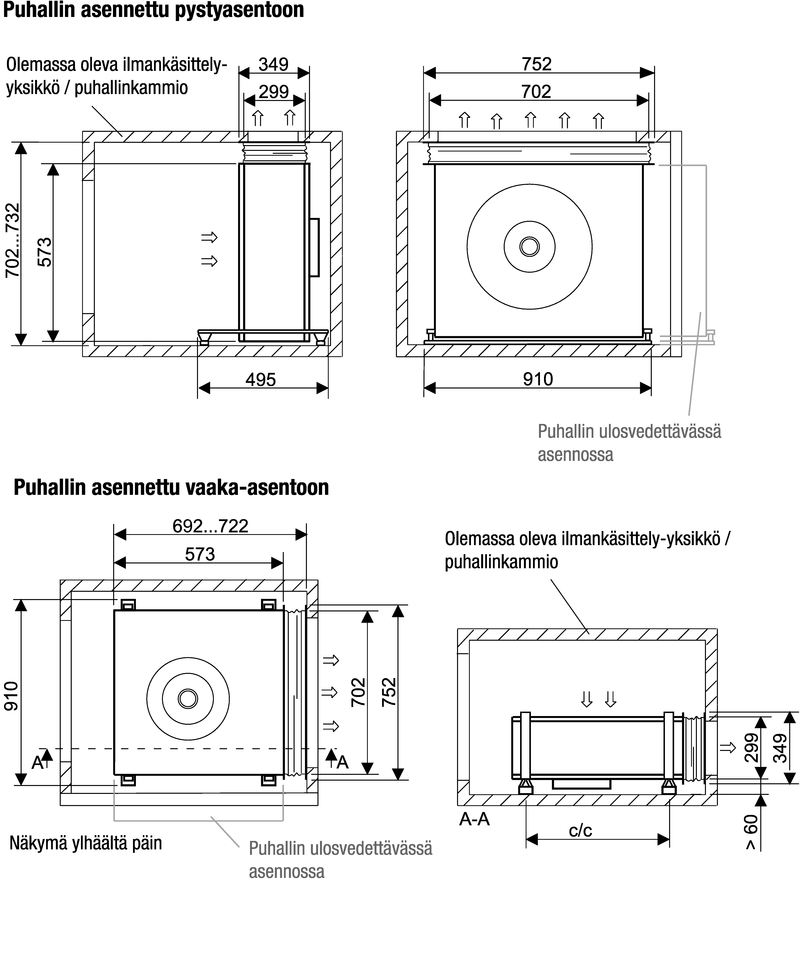 B-siipinen imukammiopuhallin laiteasennuksiin ja kattoläpivienteihin. Yhdeltä puolelta imevä puhallin, jossa on ulkoroottorimoottori ja taaksepäin taivutetut siivet. Puhallin on kompakti kooltaan, ja voidaan asentaa ilmanpoisto- ja LTO-laitteisiin. Puolispiraalityyppinen puhallinkaapu on valmistettu galvanoidusta teräspellistä. Tärinävaimennettu alusta ja joustava painepuolen liitin sisältyvät toimitukseen.