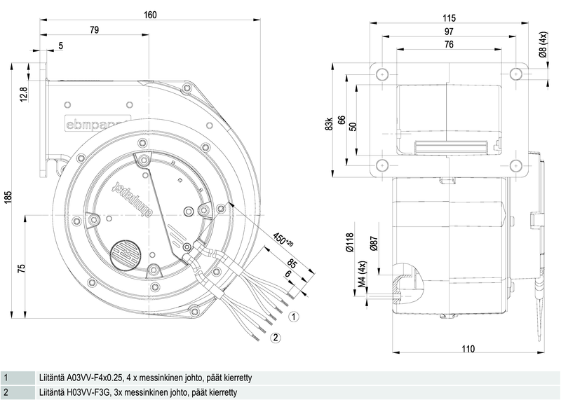 Yhdeltä puolelta imevä radiaalipuhallin eteenpäin taivutetuin siivin. Varustettu energiaa säästävällä EC-moottorilla, jossa on integroitu käyttö- ja ohjauselektroniikka.