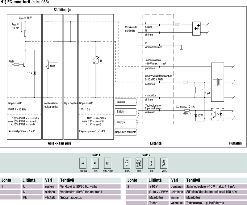 – Kierrosnopeutta ohjataan 0-10 V signaalilla tai PWM:llä