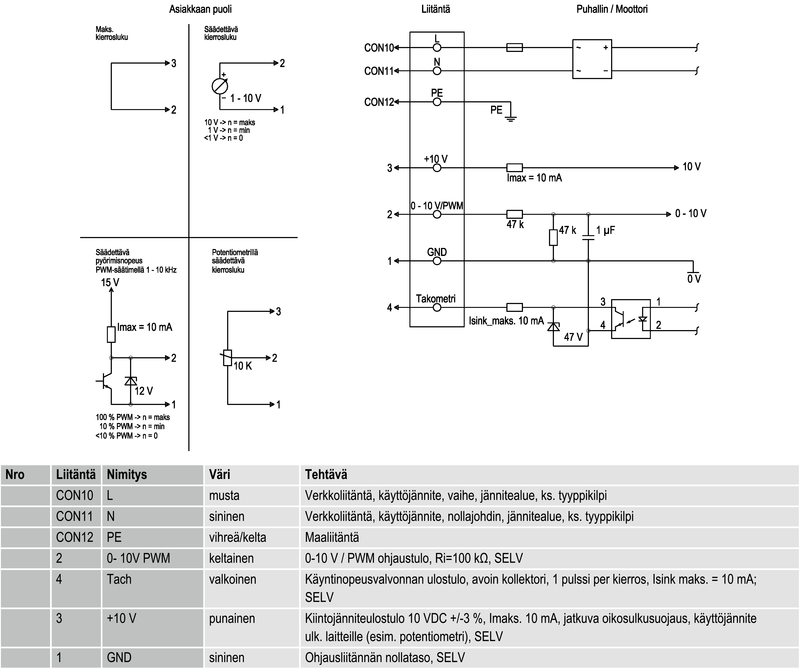 – Kierrosnopeutta ohjataan 0-10V signaalilla tai PWM:llä