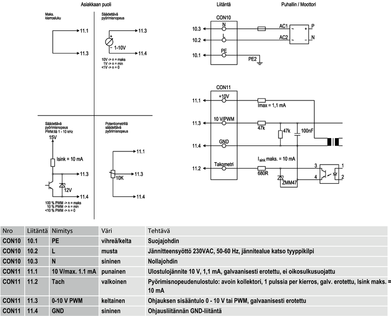 – Kierrosnopeutta ohjataan 0-10 V signaalilla tai PWM:llä
