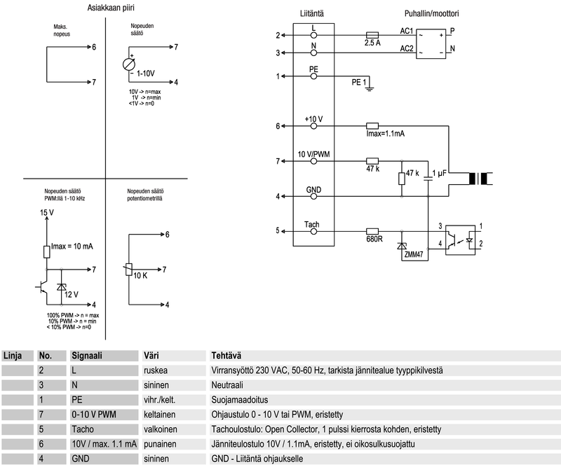 -Kierrosnopeutta ohjataan 0-10 V signaalilla tai PWM:llä