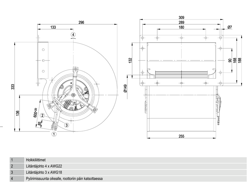 Molemmin puolin imevä radiaalipuhallin eteenpäintaivutetuin siivin. Varustettu energiaasäästävällä EC-moottorilla jossa on integroitu käyttö- ja ohjauselektroniikka.