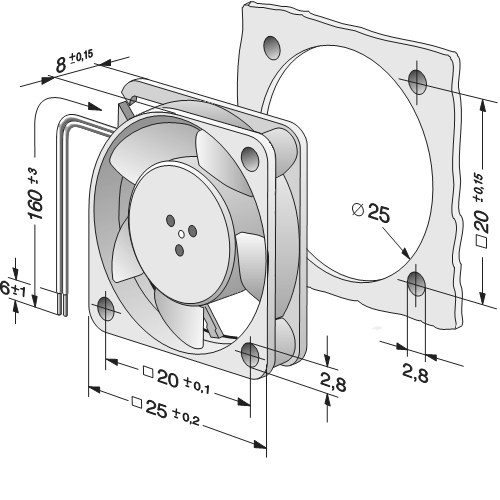 | Siipipyörä | Muovia PA, taaksepäin kaartuvat siivet 6 kpl |