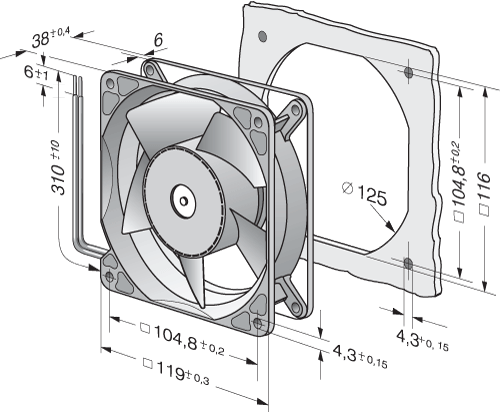 | Siipipyörä | Muovia PA, taaksepäin kaartuvat siivet 6 kpl |
