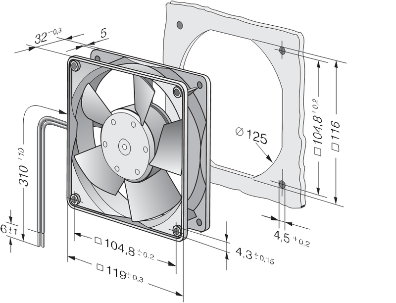 | Siipipyörä | Muovia PA, taaksepäin kaartuvat siivet 6 kpl |