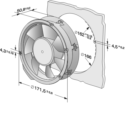 | Siipipyörä | Muovia PA, taaksepäin kaartuvat siivet 6 kpl |