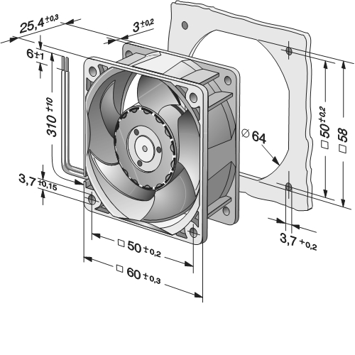 | Siipipyörä | Muovia PA, taaksepäin kaartuvat siivet 6 kpl |