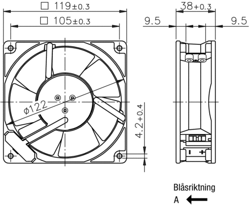| Siipipyörä | Muovia PA, taaksepäin kaartuvat siivet 6 kpl |