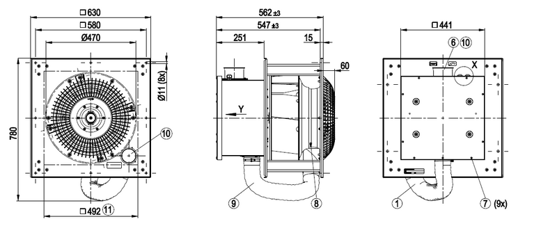 Elanslutning sker via den inbyggda kopplingsboxen och fläkten kan styras via Modbus-RTU samt 0-10 Vdc kontroll signal.