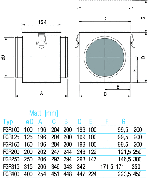 Suodatinkasetti FGR on varustettu suoralla luokan EU3 suodattimella. Kasetti on valmistettu galvanisoidusta teräspellistä kumitiivistetyillä liitännillä, lukittavalla luukulla sekä kertakäyttösuodattimella. Suodatinkasetti sopii tuloilmasuodattimeksi teollisuuteen ja verstaisiin. Kuivausrummun poistoilmalle suositellaan suoraa suodatinta Nytrel joka on saatavissa koossa 100 – 200. Suositeltu lopullinen painehäviö EU3 suodattimelle on 170 Pa.
