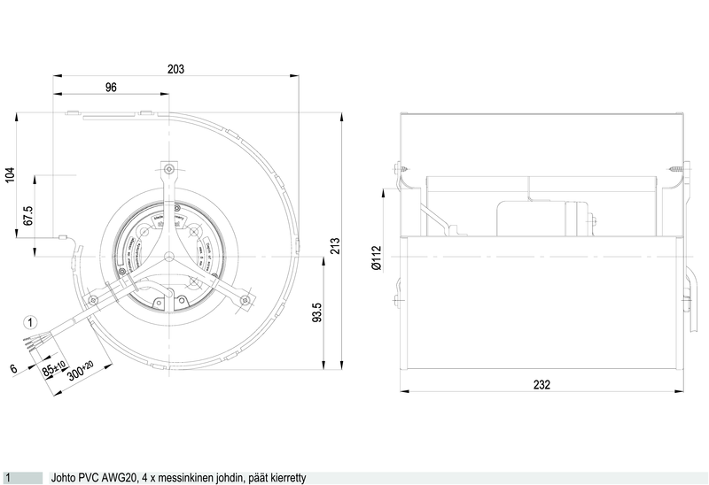 | Siipipyörä | Muovia PA, taaksepäin kaartuvat siivet 6 kpl |