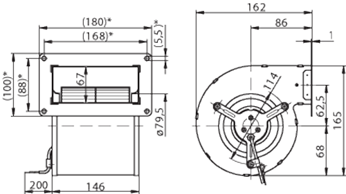 | Siipipyörä | Muovia PA, taaksepäin kaartuvat siivet 6 kpl |