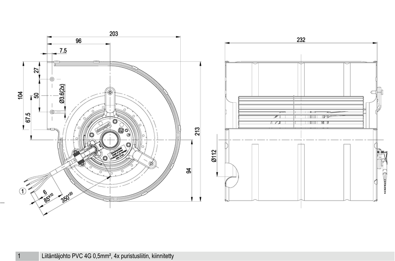 | Siipipyörä | Muovia PA, taaksepäin kaartuvat siivet 6 kpl |