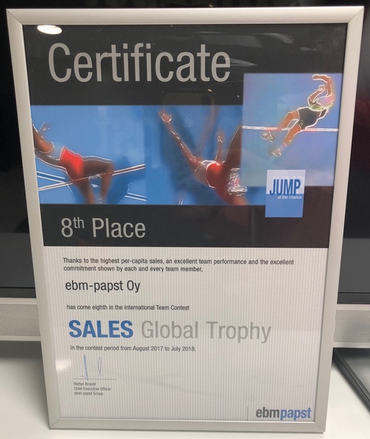 Toimitusjohtaja Frank From vastaanotti kunniakirjan Suomen ebm-papstin 8. sijasta kansainvälisessa myyntikilpailussa.