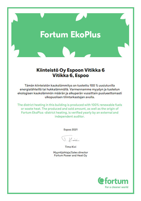 Varastokiinteistössämme Espoon Vitikassa on käytössä kotimainen vesisähkö kattaen 100% kulutuksesta, ja myös kaukolämpö tuotetaan 100% uusiutuvilla energialähteillä tai hukkalämmöllä. Nämä varmennetaan vuosittain ulkopuolisen tarkastajan avulla.